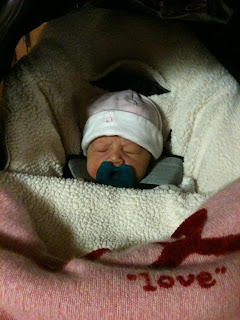 Now, I guess onto the bad. Yesterday I was talking about how Mya is finally 100% from her month of hell with the pneumonia, cold after cold after cold. She was off the nebulizer for 3 days, no runny nose, no cough, 100% right? Until last night, I come home and thought she felt warm, Ry says no, you were just outside and your hands are cold, fine I let it go. She wasn't very hungry for dinner and yawning at like 6pm, she usually goes to bed 7:30-8ish. We give her her tub at 6:45 and she's great, loving the tub as usual, playing, laughing and all. We take her out and it's around 7ish, I said to Ry, she feels hot, I'm taking her temp. We take it and it's 101.6!!!!! I almost cried, like seriously, HOW ON EARTH could our little girl be sick again, SO NOT FAIR!! I call the Dr and make an appt for first thing this morning. She slept fine, woke at 4, had a 100.6 temp. This morning her temp was at 101.4. The Dr checks her out, listens to her back and chest, everything sounded fine. Checks out her ears, BOTH of them are red, she's got a double ear infection!!!!! I immediately start crying, how can my baby girl have to go through all this??? WHY?? I just wanted to take those ear infections and beat the crap outta them! You would have NEVER been able to tell if she hadn't had a fever (although Aunt Mary informed me that she's been tugging her ears today and started screaming when she laid her down to change her diaper, poor pooks). So, back on antibiotics for 10 days. Here she is this morning before leaving for the Dr. Happy little lovebug.